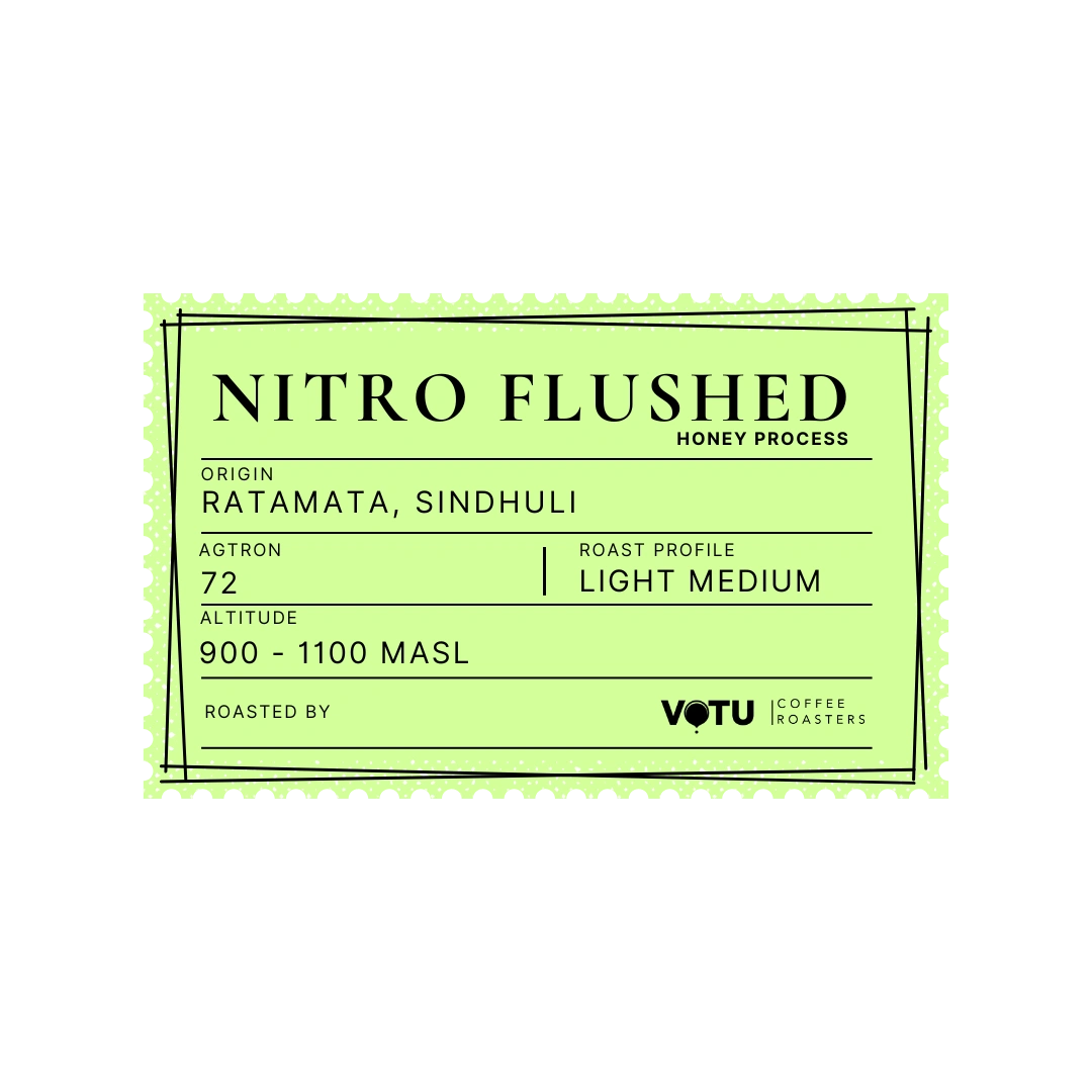 Nitro Flushed Honey Process : The process involves coffee that is process in a low oxygen environment by flushing with nitrogen to preserve freshness and delicate aromas enhancing sweetness and fruit notes.